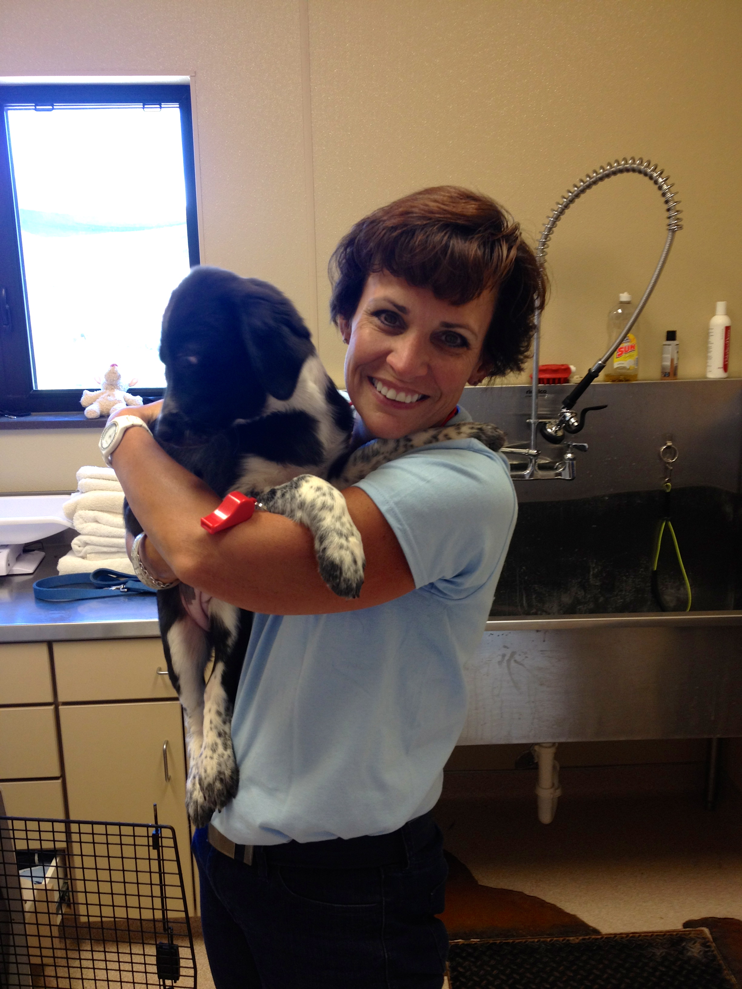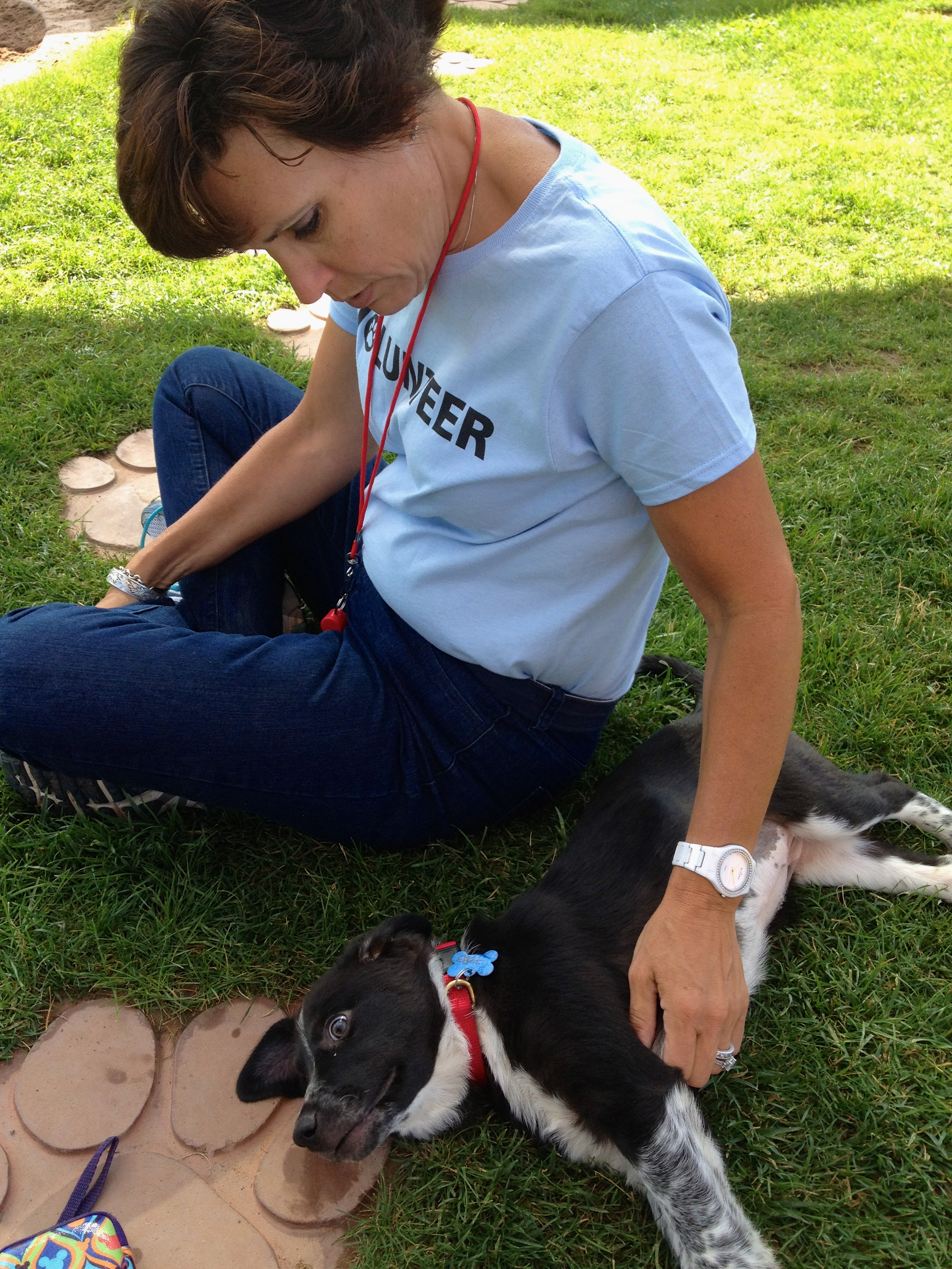 The next day we went to puppy preschool (ages 3 months to a year) and helped to clean the pens and serve the puppies breakfast. It was quite the production when you are dealing with 21 hungry, hyper and loud pups! We got to take 4 litter mates out to the “park” so they could run, dig, play and tackle each other.