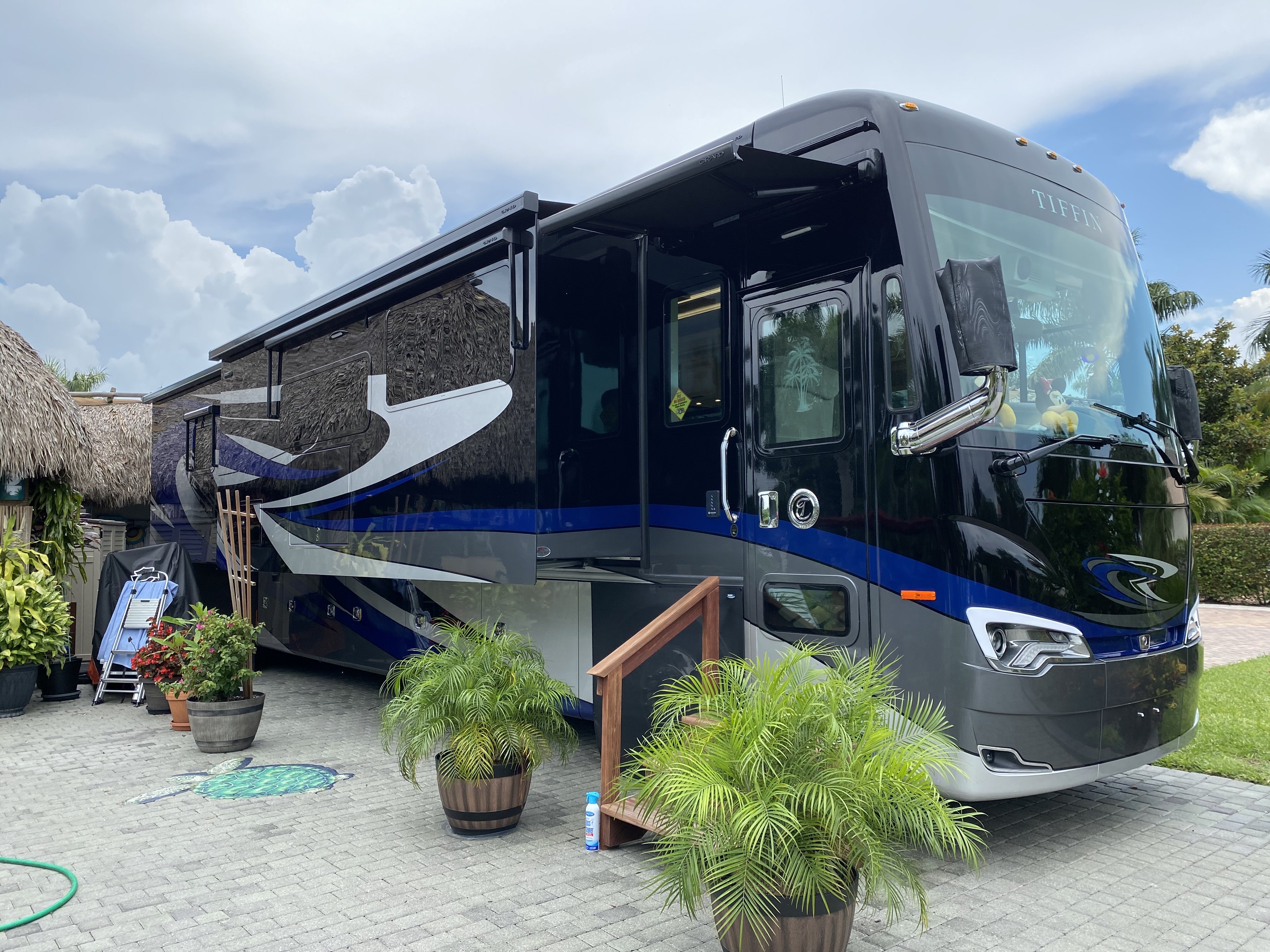 We wanted to update and upgrade our blog regarding our current living accommodations. We finished redesigning our tiki hut by replacing pavers with travertine tile. We also added a knee wall, a new kitchen and removed the tiki curtains, replacing them with screens and hurricane proof shutters. In 2020, we traded in our 2013 Class A 40′ Thor Tuscany and purchased a 45′ Class A Tiffin Allegro Bus. We are about to begin our first somewhat lengthy journey by visiting what are considered “Upscale RV Resorts” in the south eastern states of Florida, Georgia, South Carolina, North Carolina, Tennessee and Alabama. We also will be pulling our new tow vehicle, a 2022 Jeep Grand Wagoneer Series III. This large SUV has all the bells and whistles and is by far, the nicest vehicle we have ever owned!