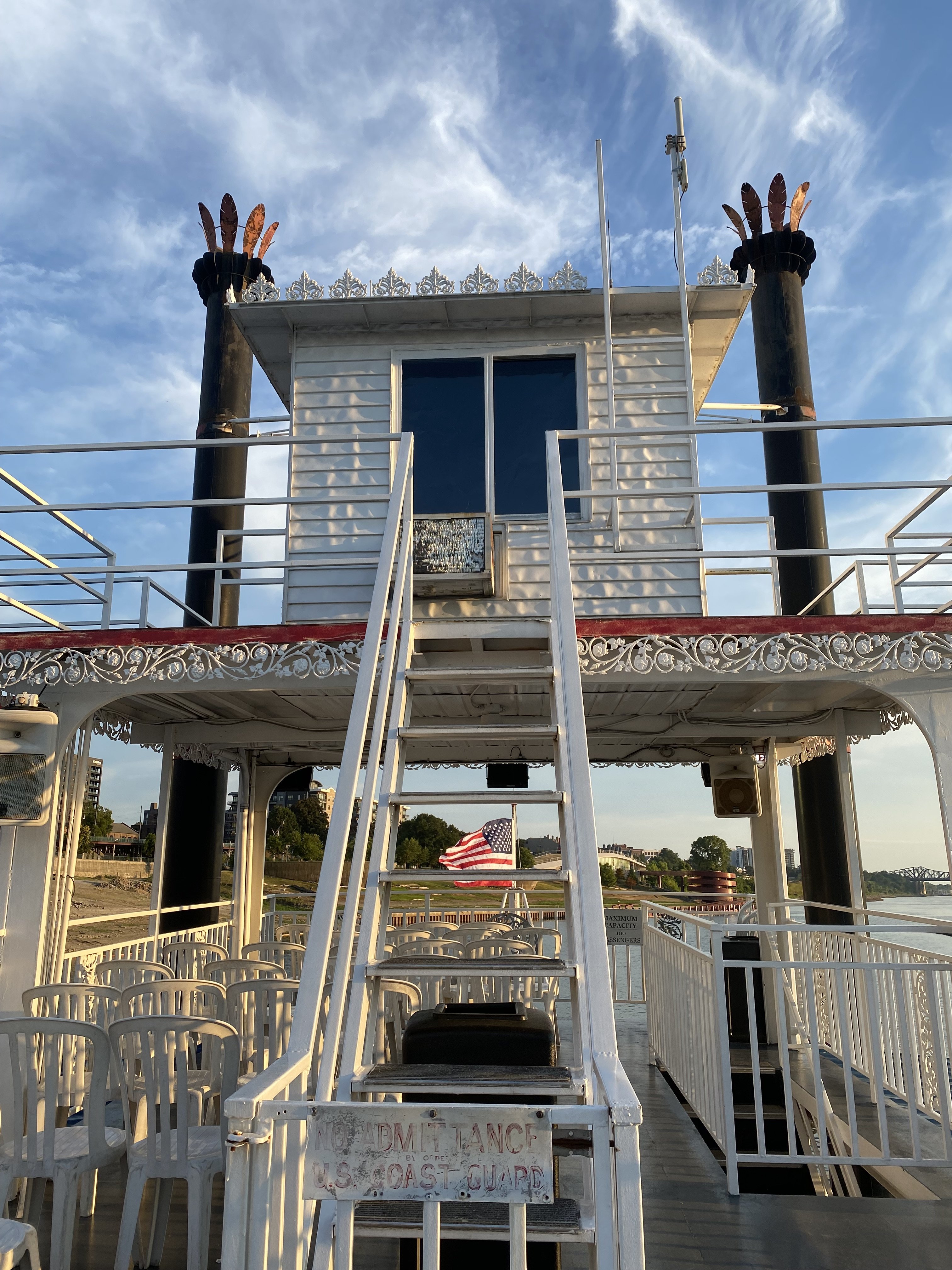 Since weather is out of our control, mother nature can cause plans to change. What appeared to be a tropical storm heading straight to our next destination, Heritage Motorcoach Resort on the panhandle in Orange Beach Alabama, we decided to stay out of the storms path. So we decided to go back to Memphis, Tennessee and revisit places we’ve been and explore new adventures. We found a campground called Tom Sawyers and parked on a site with an amazing view of the Mississippi River. When we entered the park we saw the sign that called it a “diluvial jungle”  which means “relating to a flood, especially the biblical flood”.  That made us a little leery as to what we were getting ourselves into and then we saw the building where the 2011 flood level got and we understood. Luckily we were in Tennessee during a dry season and had nothing to worry about, but seeing how high the river can get and cause such devastation was a little humbling. We saw many barges going up and down the river everyday. In the spring when all the snow melts up north, this is one of the many places that flood.