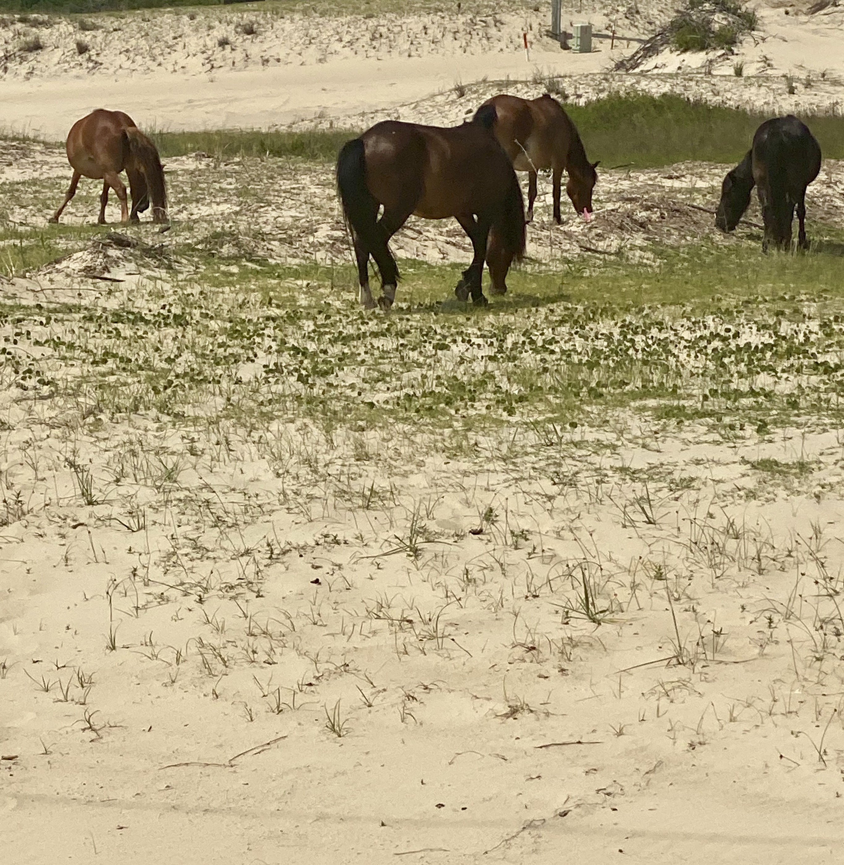 The highlight of our visit to the Outer Banks was a 2 hour tour, 4 wheeling on the beach looking for the wild horses that lived on the beaches and surrounding area on the barrier islands in Corolla NC. These horses have been here for hundred of years brought to the beaches by the Spaniards. There were 17 harems (a family consisting of a stallion and 3-4 mares) and we saw at least a quarter of them. The end of the tour we captured a beautiful site of a 7 week old foal nursing from her mother.