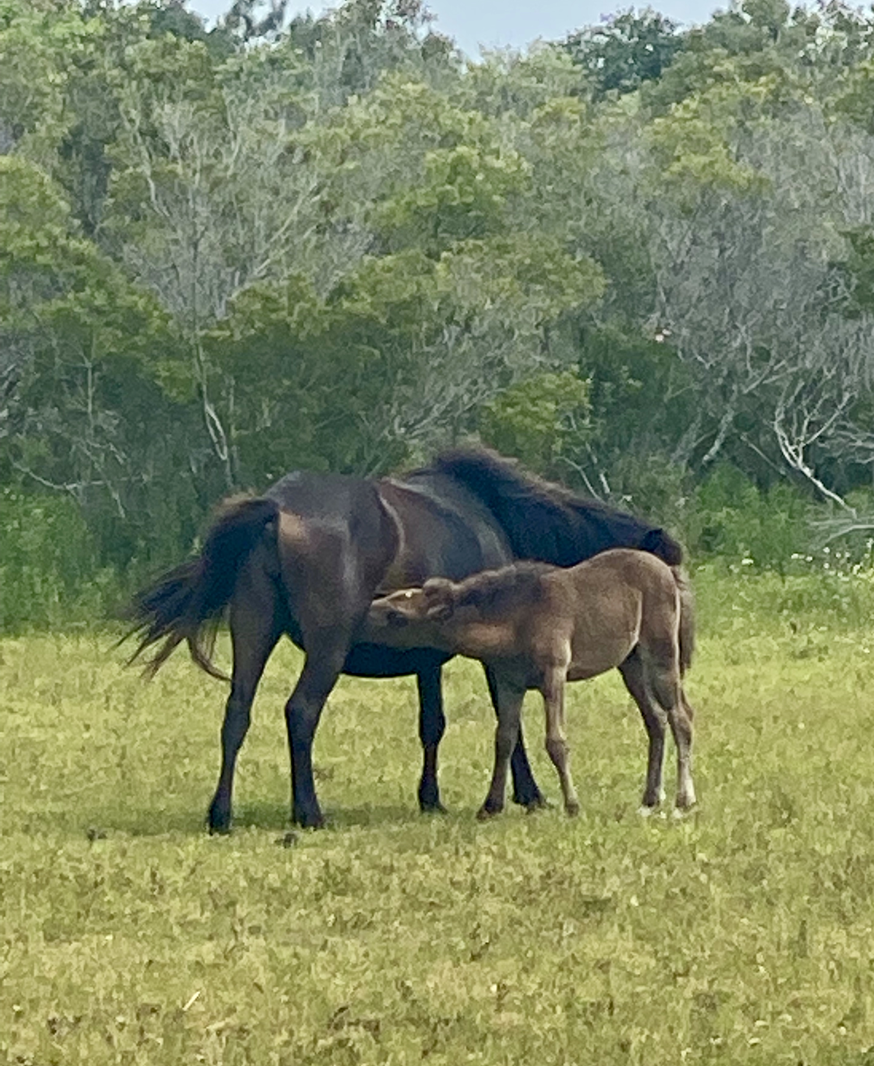 The highlight of our visit to the Outer Banks was a 2 hour tour, 4 wheeling on the beach looking for the wild horses that lived on the beaches and surrounding area on the barrier islands in Corolla NC. These horses have been here for hundred of years brought to the beaches by the Spaniards. There were 17 harems (a family consisting of a stallion and 3-4 mares) and we saw at least a quarter of them. The end of the tour we captured a beautiful site of a 7 week old foal nursing from her mother.